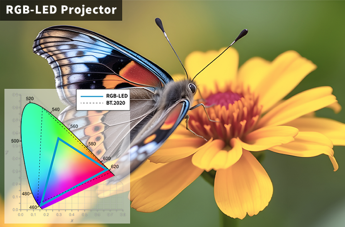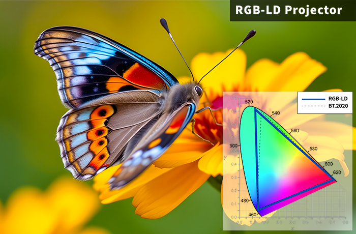 与采用 LED 或传统灯泡光源的投影机相比,使用激光二极管(LD)的投影机具备更宽广的色域,色彩表现更加生动。激光二极管以极窄的带宽(光谱宽度)发光,使每个 RGB 色彩纯度极高,避免色彩混浊,呈现传统光源难以再现的丰富色彩和逼真的三维效果。此外,即使在环境光下也能保持宽广的色域,因此无论是家庭影院、电影院、明亮的会议室,还是大型活动场所,都能带来身临其境、逼真且高质量的视觉体验。