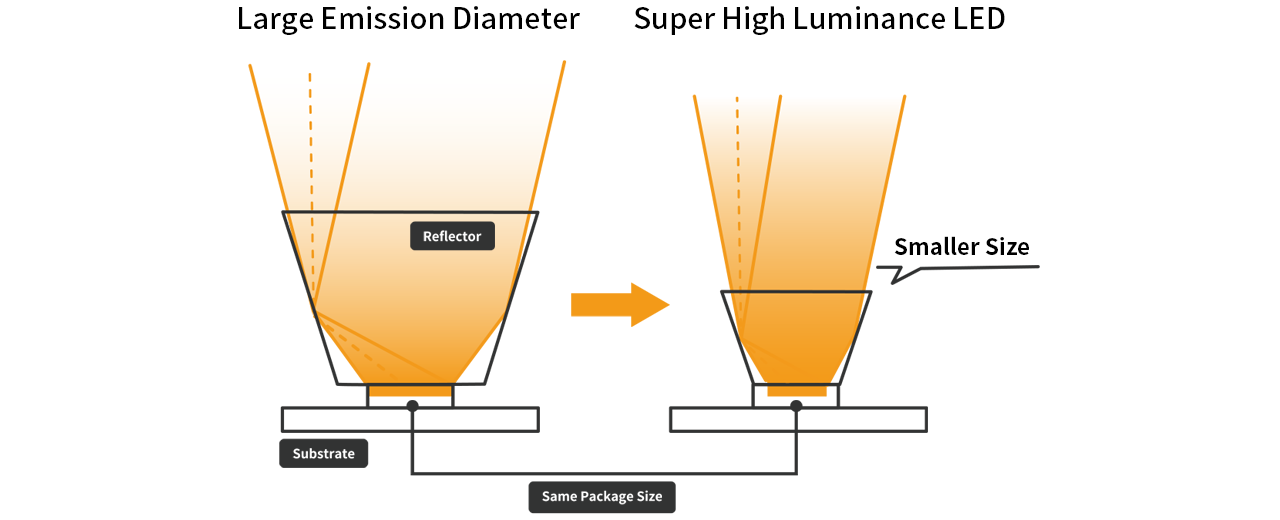 - Super High Luminance LED (Part No. NVSW719AC): By emitting high-output light from a small light-emitting area, the central luminous intensity of the lamp is increased. As a result, sufficient light output can be achieved even with a small secondary optical system, directly contributing to material savings in the fixture.
