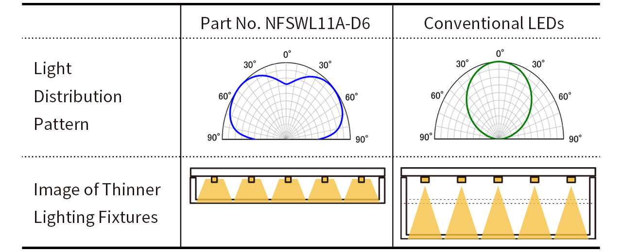 - Ultra-wide Light Distribution LED (Part No. NFSWL11A-D6): The ability to uniformly distribute light over a wide area allows simplification of optical components such as diffusers and reflectors that were previously required, enabling a thinner and more streamlined lamp design.