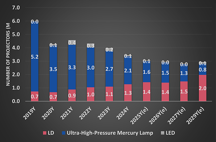 Mercury lamps, which have been widely used as light sources for projectors, pose the risk of environmental pollution. Therefore, laser diodes (LDs), which do not contain mercury, are expected to replace them. However, LD light sources are not widespread yet since many of the projectors used in conference rooms and educational settings (2,000 to 8,000 lm) still use ultra high-pressure mercury lamps. Nichia continues to promote replacing mercury lamps with LDs—long-lasting, energy-saving light sources—to contribute to cost reduction and environmental preservation.