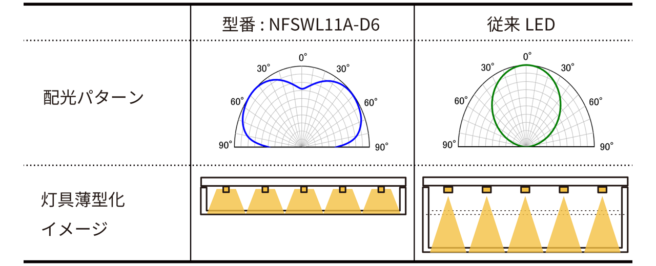 - 超広配光LED(型番:NFSWL11A-D6):光を均一に広範囲へ照射できるため、従来必要だった拡散板や反射板などの光学部品を簡素化でき、灯具の構造をより薄く、シンプルに設計することが可能です。